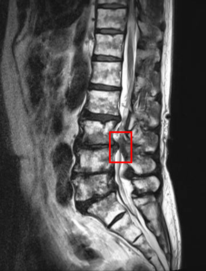 この患者様は赤い枠で示されている箇所(L3/4)に脊柱管狭窄症を認めます。