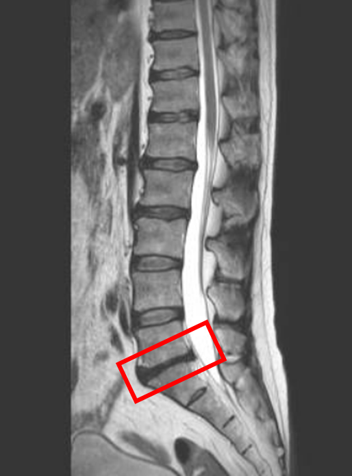 この患者様は赤い枠で示されている箇所(L5/s)に椎間板変性症を認めます。