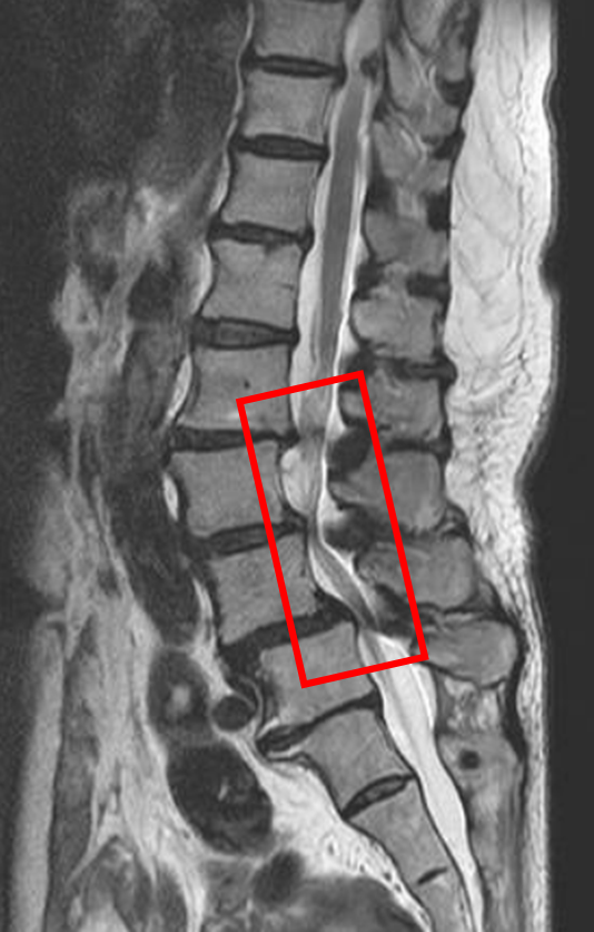 この患者様は赤い枠で示されている箇所(L2/3,3/4,4/5)に脊柱管狭窄症を認めます。