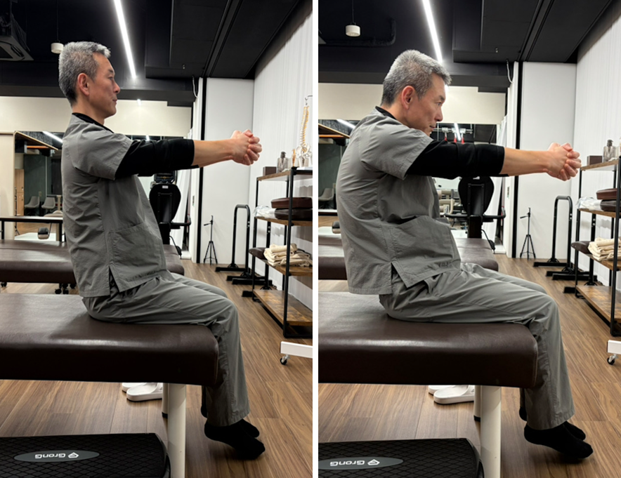 2.両手を身体の前方に絡ませて、前に突き出す。