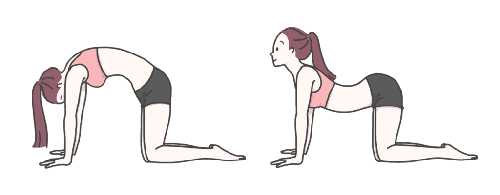 キャット&カウのストレッチは、四つん這いで背中を反らせたり丸めたりして、骨盤の歪みを調整し、痛みに有効です。