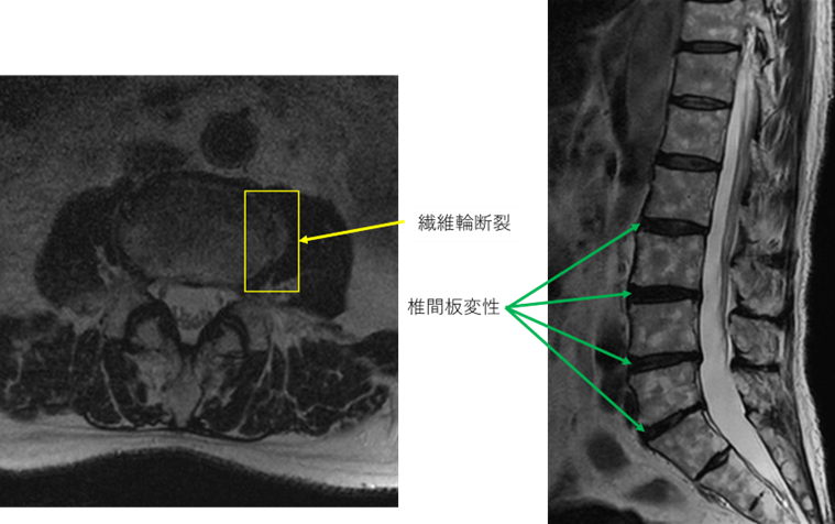 椎間板変性、線維輪断裂 を認め、主症状の原因の可能性が高い。