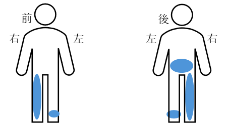 主な痛みの部分-両側腰部、右下肢背側・外側・内もも・脛痛み、しびれ、両足底しびれ