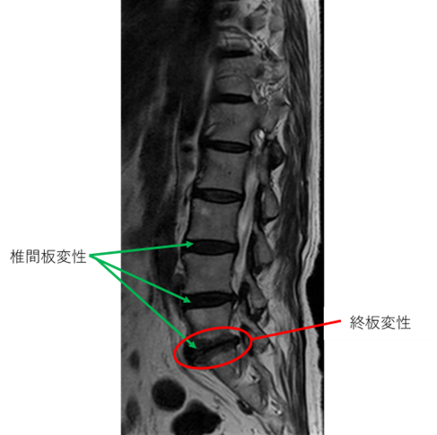 椎間板変性症、不安定症、終板変性 を認め、主症状の原因の可能性が高い。