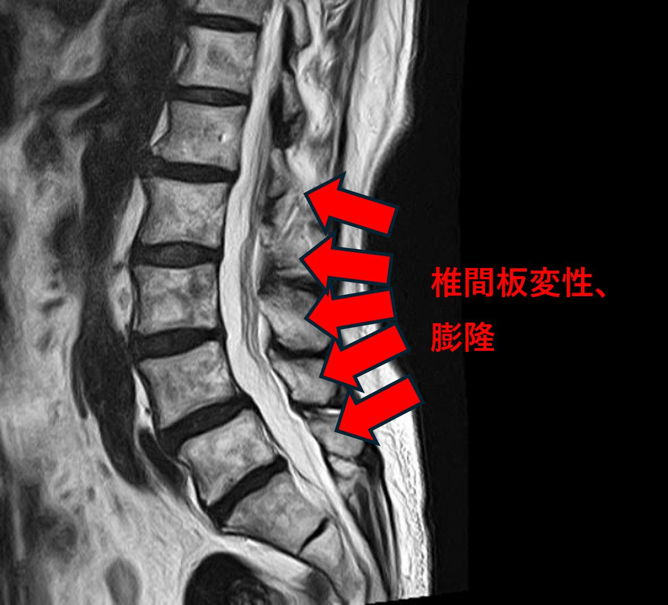 L1/2、3/4、4/5の椎間板所見による脊柱管の圧排が、症状の原因の可能性がもっとも高い。
