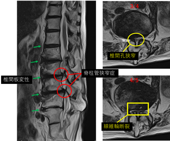 椎間板変性、脊柱管狭窄症、線維輪断裂 を認め、主症状の原因の可能性が高い。
