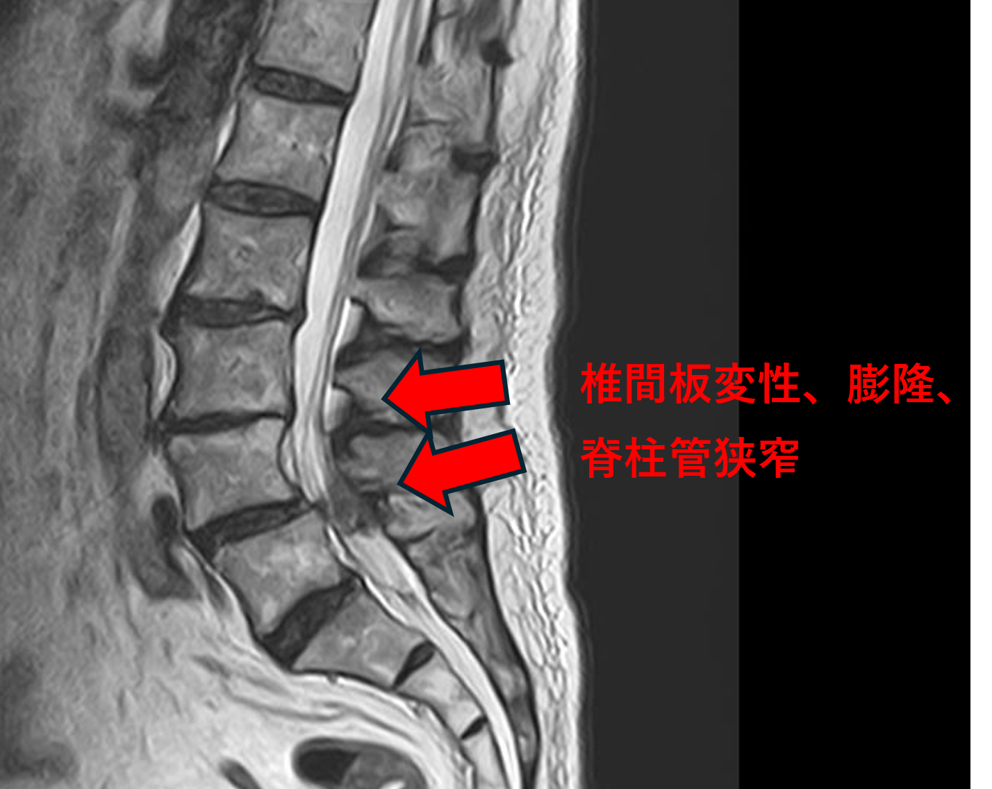 • L4/5 – 椎間板変性、膨隆、脊柱管狭窄