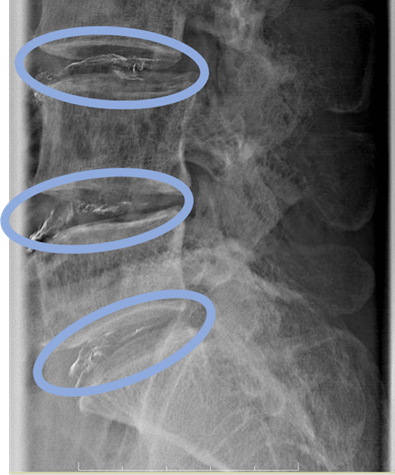 L3/4: 椎間板変性、黄色靭帯肥厚、脊柱管狭窄症