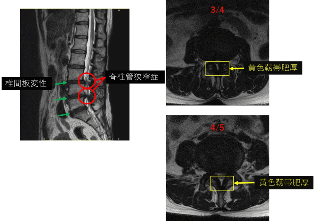・L3/4、4/5、5/S-椎間板変性、黄色靭帯肥厚、脊柱管狭窄症を認め、主症状の原因の可能性が高い。