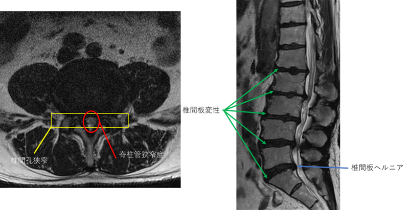 椎間板変性症、椎間孔狭窄、脊柱管狭窄症、椎間板ヘルニア を認め、主症状の原因の可能性が高い。