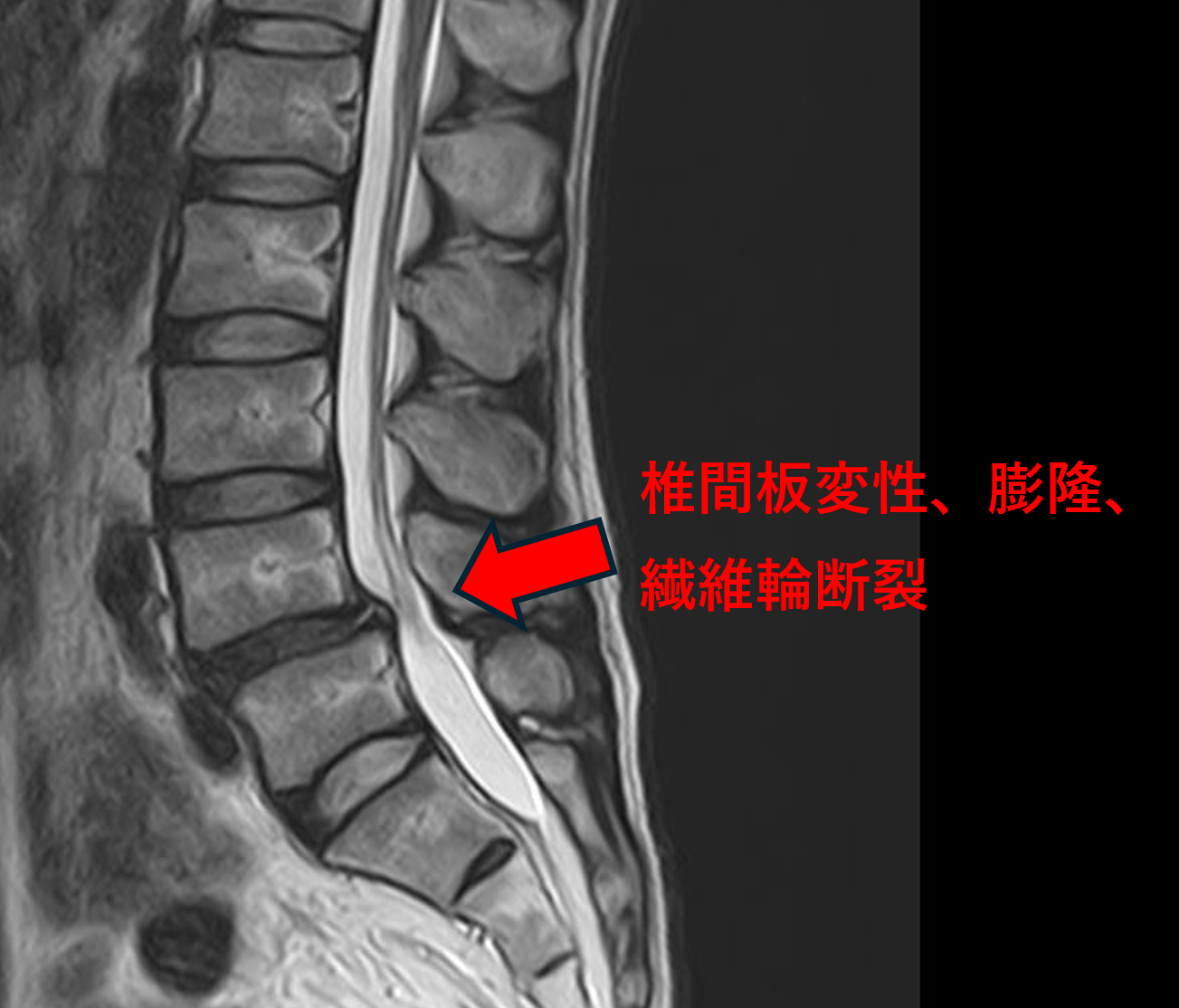 - L4/5 – 椎間板変性、膨隆、繊維輪断裂、変性すべり