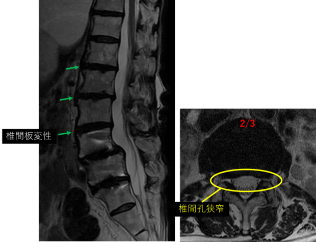 L2/3: 椎間板変性、膨隆、左椎間孔狭窄