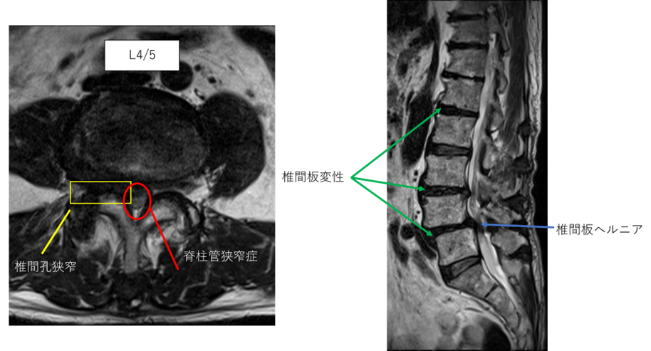 L4/5: 椎間板変性症、椎間板ヘルニア、脊柱管狭窄症、右椎間孔狭窄