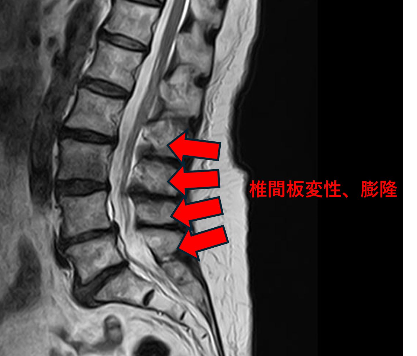 • L4/5、5/s – 椎間板変性、膨隆、椎間孔狭窄
