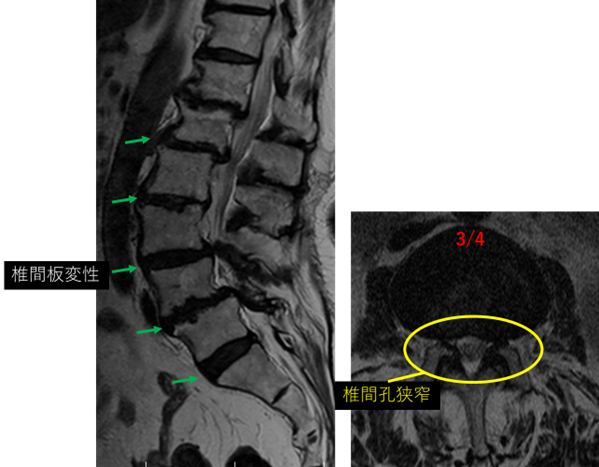 椎間板変性、椎間孔狭窄 を認め、主症状の原因の可能性が高い。