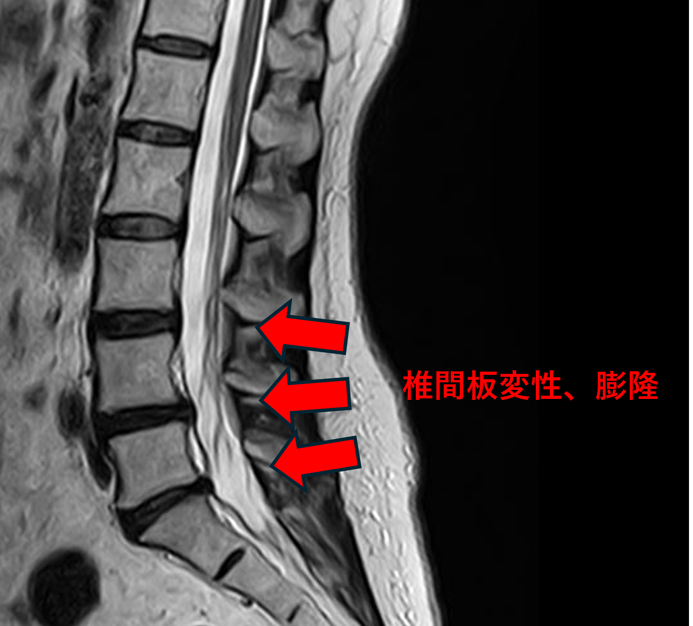 L3/4、4/5、5/sの椎間板所見による脊柱管の圧排が、症状の原因の可能性が高い。