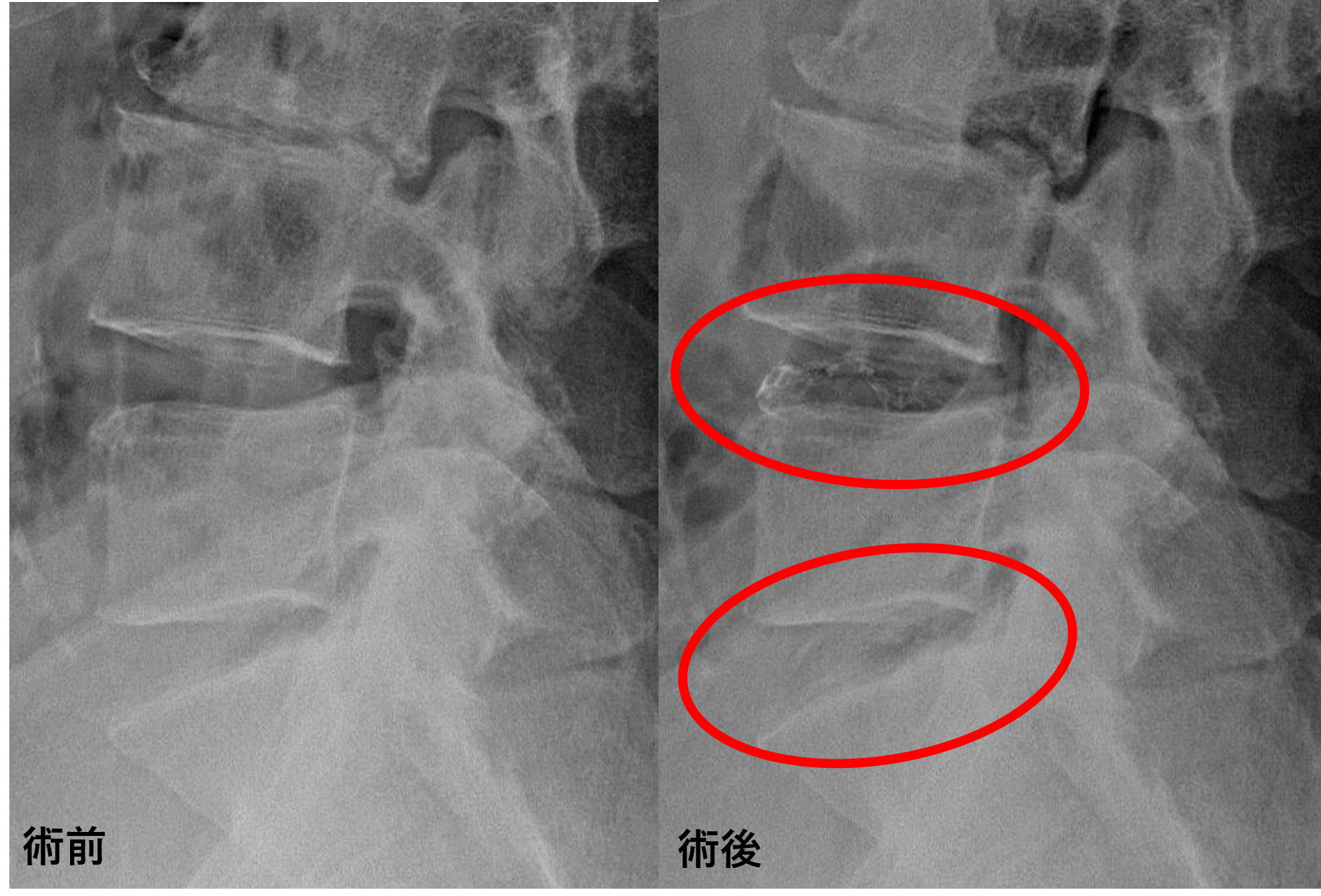 - L4/5 – 椎間板変性、膨隆、椎間孔狭窄、脊柱管狭窄、変性すべり