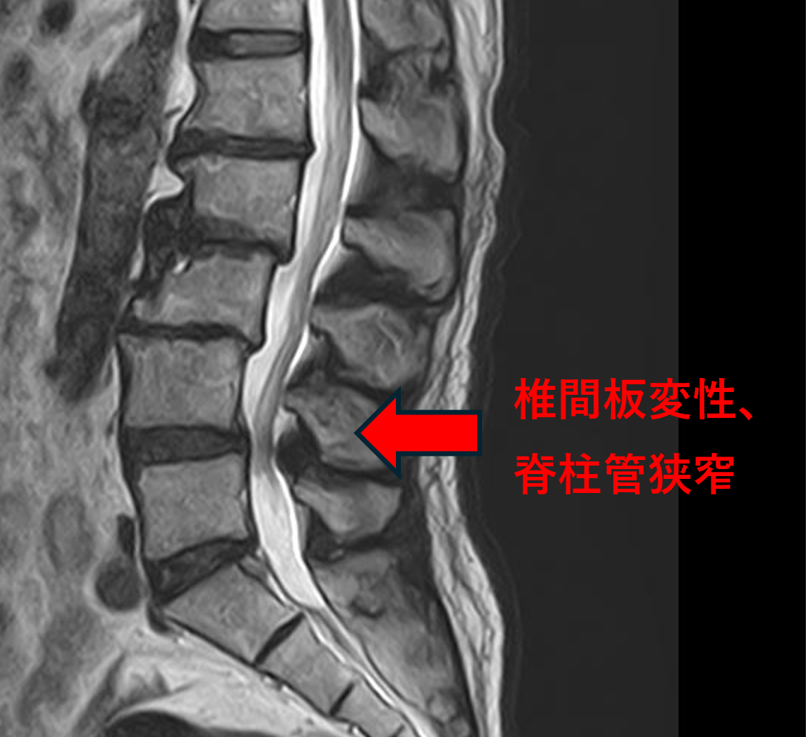 L4/5、5/sの椎間板所見による脊柱管の圧排が、症状の原因の可能性が高い。