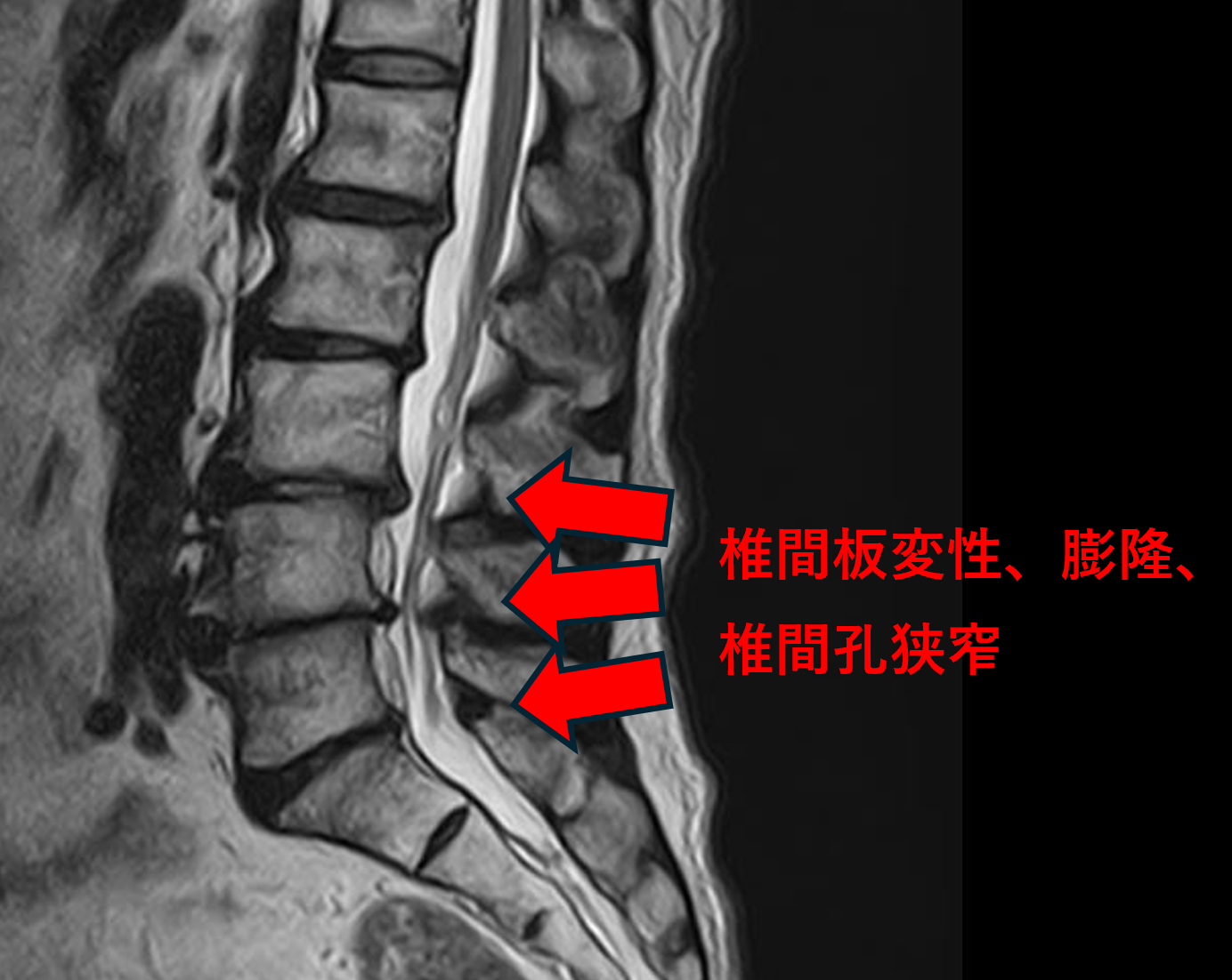 L3/4、4/5、5/sの椎間板所見による脊柱管の圧排が、症状の原因の可能性が高い。