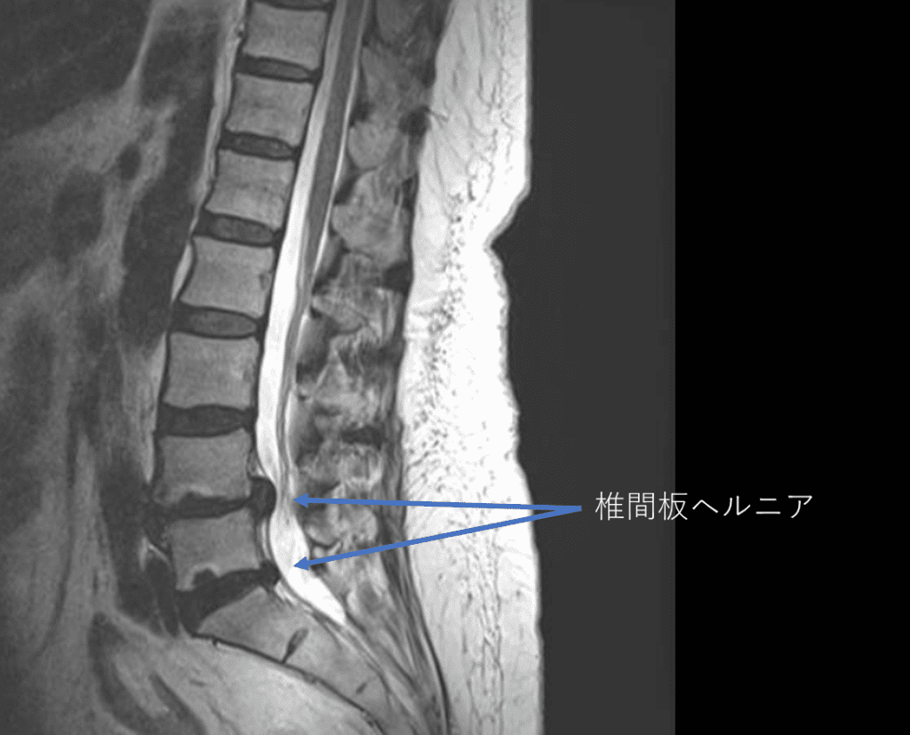 ・L4/5,5/s-椎間板ヘルニアを認め、主症状の原因の可能性が高い