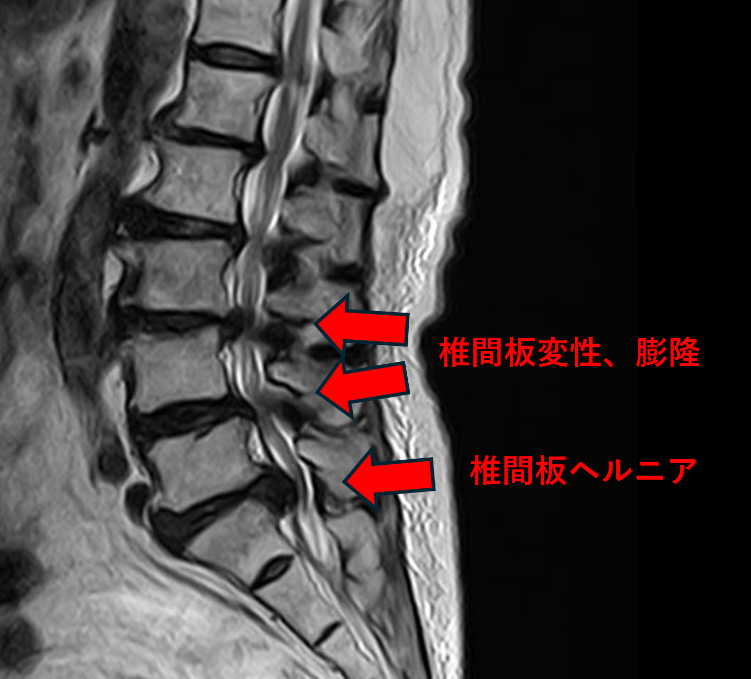L3/4、4/5、5/sの椎間板所見による脊柱管の圧排が、症状の原因の可能性が高い。