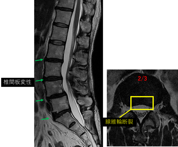 椎間板変性症、椎間板膨隆、繊維輪断裂、終板変性 を認め、主症状の原因の可能性が高い。