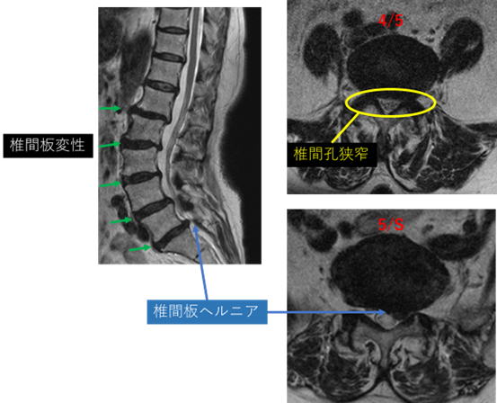 L1/2、2/3、3/4、4/5、5/S に椎間板変性、椎間板ヘルニア、椎間孔狭窄 を認め、主症状の原因の可能性が高い。