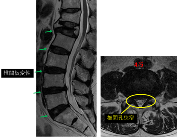 L4/5: 椎間板変性、膨隆、両椎間孔狭窄