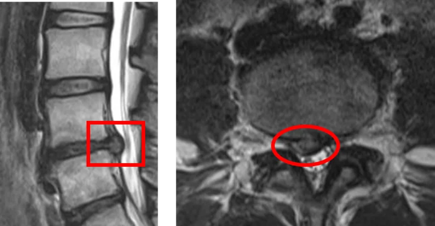 MRI画像での椎間板ヘルニア(左は矢状断からみた画像で、右は横断面からみた画像)