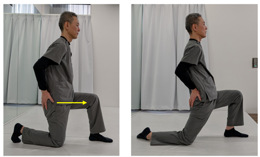 股関節の前の筋肉を伸ばします。この筋肉が固くなることで骨盤が前傾し、反り腰になり、反り腰になることで腰痛が悪化しやすくなります。