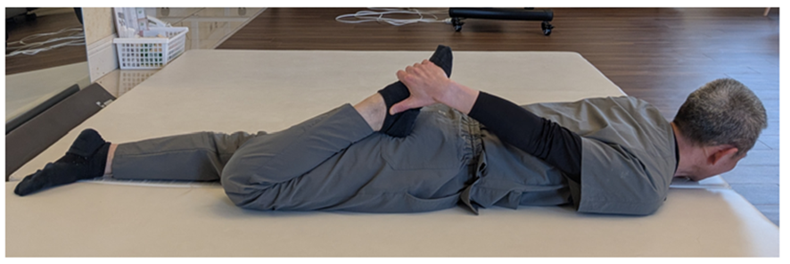 太ももの前の筋肉を伸ばします。この筋肉が固くなることで骨盤が前傾し、反り腰になりやすくなり、それで腰痛が悪化しやすくなります。
